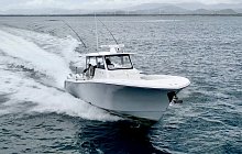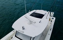 Designed with both fishing and cruising in mind, the layout features expansive cockpit space, dual livewells, macerated fish boxes, fresh and saltwater washdowns, and abundant rod storage. The fiberglass hardtop with aluminum framing includes an electric sunroof, and the vessel is equipped with a tower and second helm station, providing excellent visibility and control offshore.